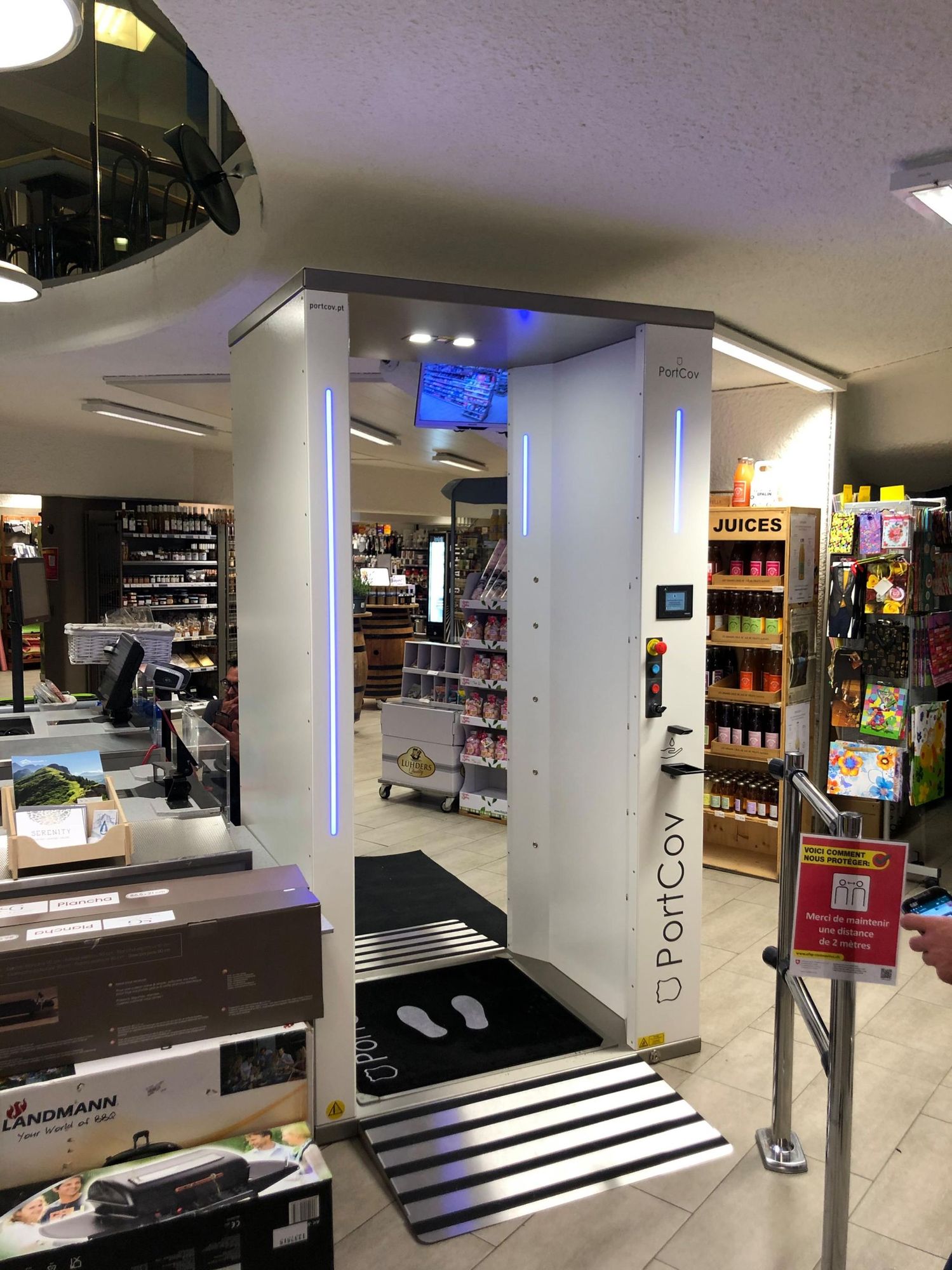 Esta máquina é o PortCov. Inventada em Portugal para lutar contra o novo coronavírus, a máquina chegou à Suíça e a primeira instalação foi feita numa loja com contrato de franschising com a cadeia Migros em Villars-sur-Ollon (VD).