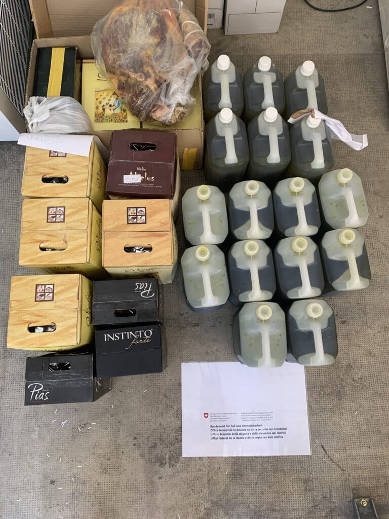 Durante a inspecção, a patrulha encontrou 47,8 quilos de carne, 89,7 litros de óleo, 87,5 litros de vinho, 0,85 litros de álcool forte e 5,2 quilos de queijo. As mercadorias destinavam-se a particulares e empresas e não tinham sido declaradas aquando da sua entrada na Suíça.